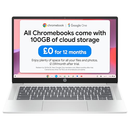 HP Chromebook 14″ | Intel Processor N100 Processor| 4 GB RAM | 128 GB Flash Storage | Intel UHD Graphics | HD Display | Up to 12hrs battery | Chrome OS | Dual Speakers | Glacier Silver | 14a-nf0002sa