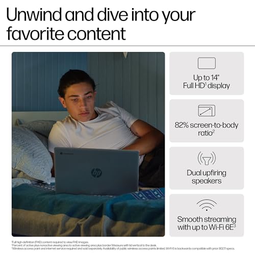 • WORRY-FREE PERFORMANCE AND ENTERTAINMENT: Stay productive and worry-free with the HP Chromebook 14”, packed with the performance of up to an Intel processor and the easy to use Chrome OS. Do more with plenty of memory, faster speeds, and wireless connectivity and enjoy faster boot and long battery life with HP Fast Charge so you can stay connected all day.