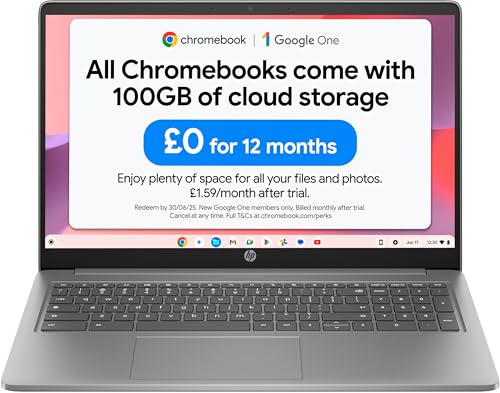 HP Chromebook 15.6″ | Intel N100 Processor | 4 GB RAM | 128 GB Flash Storage | Intel UHD Graphics | HD Display | Up to 11.5 Hours Battery | Chrome OS | Dual Speakers | Mineral Silver | 15a-nb0005sa